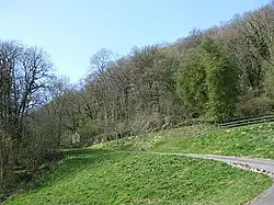 Queen's Wood Country Park sits within woodland atop the hill to the west of the road. An area of the flat hilltop to the east of the road was the subject of an archaeological dig by the Time Team television programme in 2009. Its three-day excavation revealed massive ditches which were interpreted as demarcating an Iron Age camp.[3]