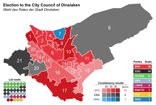 The Dinslaken city council governs the city alongside the Mayor. The most recent city council election was held on 13 September 2020, and the results were as follows: