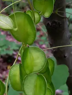Dioscorea villosa flower petal color is commonly known to be green to brown, or white. Lengths of the flower petals range from 0.5 to 2 mm (1⁄32 to 3⁄32 in). The flowers tend to grow out of the axil; this is the point at which a branch or leaf attaches to the main stem. There is only one flower present on the inflorescence. The fruit of the plant is a capsule that splits and releases the seeds within to then begin the dispersal process[9] The fruit of Dioscorea villosa ranges in size from 10–30 mm (3⁄8–1+3⁄16 in).[10] The flower does not produce aerial bulblets. The leaves are heart-shaped, usually a whorl of four at each node, but there can be as many as nine in a whorl.[11]
