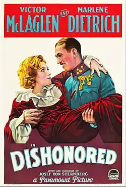 Dishonored is a 1931 American pre-Code romantic spy film directed and edited by Josef von Sternberg, who also co-wrote the film with Daniel N. Rubin. It was produced and distributed by Paramount Pictures. The film stars Marlene Dietrich, Victor McLaglen, Gustav von Seyffertitz, and Warner Oland, and follows a female spy (Dietrich) for Austria-Hungary during World War I. Costume design was provided by Travis Banton, in one of his several collaborations with Dietrich.