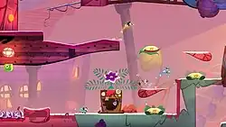 The game lacks any direct combat mechanic, so players have to avoid attacks from enemies encountered throughout the journey.[7][13] The game sometimes has areas where players engage in boss fights, during which they have to avoid attacks, press buttons or perform other platforming activities in order to indirectly harm the boss.[9][14] Getting hit makes players lose one life (represented as a heart), and losing all their lives makes them return to the last mailbox that they passed through (functioning as a checkpoint). Each player can adjust the number of lives given at the beginning of a checkpoint and can also choose to activate invincibility mode.[10][15] The game offers a local co-op multiplayer mode, enabling players to hug others to restore both their lives and drop ropes to help other players climb obstacles.[6][8]