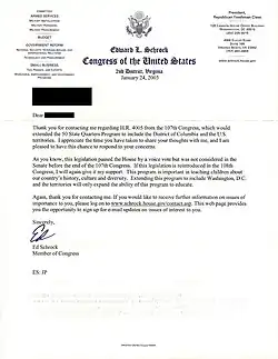 - ^ Fenty, Adrian M. (June 19, 2008). "Recommendation Letter to the U.S. Mint" (PDF). Government of the District of Columbia: Office of the Secretary. Retrieved January 15, 2018. "Archived copy" (PDF). Archived from the original on January 15, 2018. Retrieved January 16, 2018.