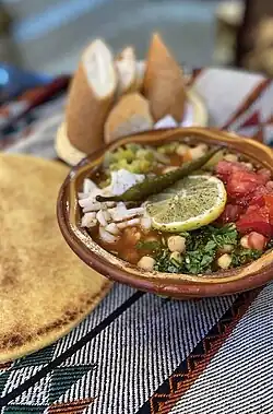 Dobara is a spicy vegetarian Algerian soup, prepared with chickpeas and broad beans and drizzled with olive oil.[1] Originally from the city of Biskra in Algeria,[2] it is generally consumed in winter in the east of the country, notably in El Oued, Batna, Khenchela, Aïn M'lila, Constantine and Djelfa.[3]