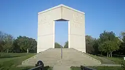The "Tribute to Olympic Athletes" was created to honor those residents of Champaign County who have competed in the Olympics. To date 41 athletes are commemorated on the monument since the tribute's dedication on July 4, 1991.[4] The monument consists of several rising plateaus forming a walkway leading to a large granite gateway. Beyond the gateway a pedestal overlooking the playing fields in Dodds Park is inscribed with the names of those who have represented Champaign County in the Olympics.