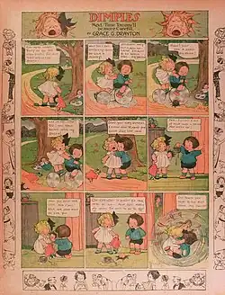 Dolly Dimples was a syndicated comic strip character created by early American female cartoonist Grace Drayton[2] which appeared in various William Randolph Hearst/King Features Syndicate publications. Over the period 1903 to 1933 the strip's main character was known by the various names "Toodles" (1903–1904), "Dottie Dimple" (1908–1911), "Dimples" (1914–1918), and finally "Dolly Dimples" (1928–1933).[1]