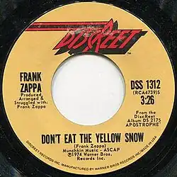 11. ^ "Frank Zappa - Don't Eat The Yellow Snow / Cosmik Debris (Vinyl)". Discogs.com. August 1974. Retrieved 2016-10-09.