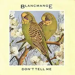 "Don't Tell Me" is a song by the English synth-pop duo Blancmange, released in March 1984 as the third single from their second studio album Mange Tout (1984). Written by Neil Arthur and Stephen Luscombe, and produced by Peter Collins,[2] "Don't Tell Me" reached No. 8 in the UK and remained in the charts for ten weeks.[3] A music video was filmed in Valencia, Spain, to promote the single.[4]