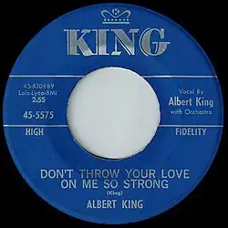 King recorded "Don't Throw Your Love on Me So Strong" in St. Louis with Ike Turner on piano.[2] It was originally released on Little Milton's St. Louis-based label, Bobbin Records, in October 1961. When the record sold well locally, it was leased to King Records and reissued in November 1961.[3][1] The song became Albert King's first hit single. It reached No. 14 on the Billboard R&B chart and No. 34 on the Cash Box R&B chart in December 1961.[4][5]