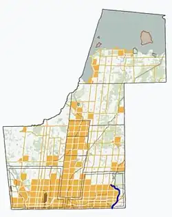 No longer known by the BGCR name, the route meanders north, slowly edging east towards Reesor Road and now surrounded by undeveloped greenspace.[4] It encounters Highway 7, north of which it becomes a divided roadway travelling on the eastern edge of Cornell as well as parallel to and alongside Reesor Road. Approaching and intersecting 16th Avenue, the road makes a broad sweeping curve northwest, continuing to serve as the boundary of urban development in Markham.[3] It narrows to a two lane road, with adjacent land along the northern side prepared for future northbound lanes, before encountering Ninth Line again.[4] Quickly curving north then east, sandwiched between the neighbourhood of Greenborough and Little Rouge Creek, the route makes a final curve north to end at Major Mackenzie Drive on the northern edge of urban development in eastern Markham.[3]