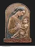 Donatello attributed[25] | Madonna and Child | relief | terracotta, gesso primer/stucco, painted, wooden back | 102.5 × 62.2 × 28.3 | c. 1410–1415 | Washington, National Gallery of Art, Samuel L. Kress Collection (Inv. 1943.4.93) |