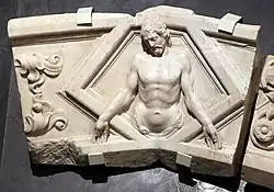 Donatello attributed or the model executed under his direction by the workshop of Desiderio and Geri da Settignano[30] | Coat of arms of the Martelli family | relief | sandstone (pietra serena), partly painted and gilded | c. 1455 | Florence, Bargello (Inv. 532 S) | |