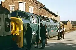 A Deltic Class 55 locomotive no.55012 Crepello coupling to the Hull-London King's Cross train as trainspotters watch on, July 1977