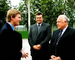 ![]() Donetsk clan leaders Rinat Akhmetov and Viktor Yanukovych (left and centre, respectively) with Russian Prime Minister Viktor Chernomyrdin | |