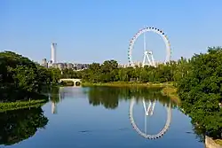 Turning southeast along Zuojiazhuang West Street, the boundary turns to follow the north bank of the Landmark River eastward at the Chunxiu Road intersection. The river bends to the east and then southeast, where a short tributary comes in 200 m west of Chunxiu. It follows that back to Chunxiu at its intersection with Dongzhimen Outer Street.[3]