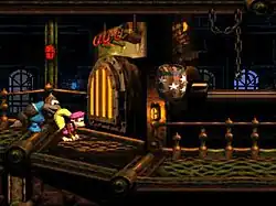 Levels in the game include a mixture of platforming, swimming and on-rails levels. They are based around several returning themes including forests, cliff-sides, factories and mountain tops. The level design is more diverse compared to its predecessors, which includes more complex puzzles and obstacles.[11] Every level has an enemy called a Koin; each of these enemies bears the DK Coin of their respective level, holding it as a shield. As these enemies always face towards the player, they must be defeated by throwing a steel barrel[12] over them so it bounces off a wall behind them in order to strike them from behind.[6] The game overworld is also more complex, allowing players to explore between each area instead of forcing them along a linear path. To achieve this, the game includes several vehicles such as a speedboat and hovercraft which can be used to traverse the overworld and access different worlds.[11][13]
