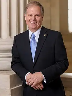 Jones announced his candidacy for United States Senate in the 2017 special election following the resignation of Republican incumbent Jeff Sessions to become U.S. Attorney General. After winning the Democratic primary in August, he faced former Alabama Supreme Court Justice Roy Moore in the general election. Jones was considered a long-shot candidate in a deeply Republican state. A month before the election, Moore was alleged to have sexually assaulted and otherwise acted inappropriately with several women, including some who were minors at the time.[3] Jones won the special election by 22,000 votes, 50%–48%.[4] Jones ran for a full term in 2020 and lost to Republican nominee Tommy Tuberville in a landslide. His margin of defeat was the largest of an incumbent senator since 2010.[5]