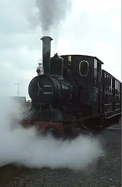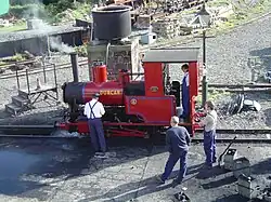 In April 1949 it was sold at auction for £60 by an engineering company called Abelson & Co (Engineers) Ltd.[2] In the early days of preservation, the Talyllyn Railway had contacted this and other similar firms asking for redundant equipment. Abelson's offered the locomotive to the Talyllyn, and in return they named it after the donor, Douglas Abelson.[4] After presentation in 1953 the locomotive was retubed and converted from 2ft gauge at Griffin Foundry, Oldbury (with the conversion being paid for by Abelson) before being taken by road to Tywyn.[5][2] At the same time as the conversion the engine's buffers were changed from a single centred buffer at each end to pairs of buffers.[6] The cab was also extended backwards by about 6 inches to allow the engine's lever brake to be replaced by a screw brake.[6]