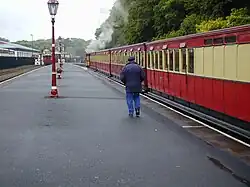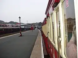 The existing platform was one of two installed in 1892 replacing the 1873 originals which were on a slightly different alignment. Both the original platforms, and the 1892 replacements were half-height, but latter were raised to full height about 1904. It should be noted the platforms are not quite perpendicular to the alignment of the booking hall. In 1909 iron canopies were erected covering the circulating area west of the main station building and both platforms for the majority of their length. These suffered from corrosion in the secondary structural members latterly, and were demolished during the initial rationalisation of the site in 1979–80. At this time too the former Port Erin platforms were demolished to make way for a bus parking area. The Port Erin platforms were situated to the south of the surviving ones. The platforms had tar macadam surfacing with stone edging. The platform edges themselves were picked out with whitewash from 1940 onwards., Initially this was due to the blackout, but it was found to be so helpful that the custom has been maintained ever since. The platform is accessed by passengers via a gate at the station end installed in the early 1980s. For many years this was usually kept closed between trains, but at the present time, the gate is usually left open but with a sign saying "Platform Closed" placed in the entrance. During the railway's annual transport festivals the platforms are occasionally open to the public for limited periods. The platforms are currently unnumbered, but in former times the northern face was number 1 and 3, and the southern 2 and 4 to assist passengers and porters in finding the Peel and Ramsey portions of combined trains to and from these destinations. The end of the platform features two semaphore signals, installed in 2005 themselves replacing two colour light signals - mounted on the 1892 Dutton post of the former Peel starting signal - that replaced original semaphores in 1983. The 2005 replacements originate from the Festiniog Railway in Wales. The platform also features cast iron lamp standards installed in 1991 when the station was refurbished, going on to win an Ian Allan Heritage Award, returning the surviving platform to something close to its mid Edwardian state. Prior to 1909, the platforms featured similar lamp posts, though these were lit by gas rather than today's versions which are electrically lit. The sloped end of the platform was modified in more recent times so that one side now features a more gradual slope which leads to the signal box and workshop facilities by way of a concrete catwalk installed in 2001 for health and safety purposes, a further pathway being connected to the foot of the signal box steps.