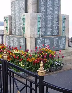 The war memorial in Douglas, Isle of Man is dedicated to those who died during World War I and World War II. The rolls of names are segregated by service and year of death.