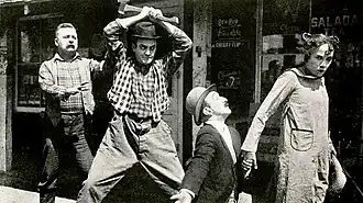 Film still showing (from left) Bert Roach, Harry Gribbon, James Finlayson, and Louise Fazenda