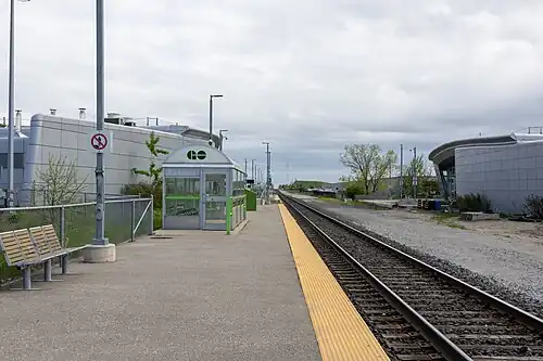 The GO Transit commuter rail station is at the surface on a north–south axis, perpendicular to the subway line. There is only one platform, but a second is roughed in and will open after the ongoing construction to double-track the Barrie line is completed.[21] The platform is located on the far side of the track near a separate surface station building accessed via the concourse, and the future second platform will be connected to the main building.