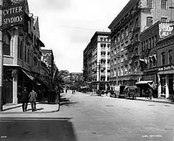 On August 4, 1889, a fire, now known as The Great Fire began just after 6:00 p.m. and destroyed the city's downtown commercial district.[22] Due to technical problems with a pump station, there was no water pressure in the city when the fire started.[23] In a desperate bid to starve the fire, firefighters began razing buildings with dynamite. Eventually the winds and the fire died down; 32 blocks of Spokane's downtown core had been destroyed and one person killed.[22] After the devastation of the fire, Spokane experienced a building boom.[24][25] The downtown was swiftly rebuilt with local investment from the regions mineral resources using brick, stone masonry, and terra cotta.[5] Within a year, 100 buildings had been built on the blank canvas that is now the downtown core, much of it from esteemed architects such as Herman Preusse, Kirtland Cutter, and John K. Dow, and Spokane was able to host the 1890 Northwest Industrial Exposition.[5] The building of downtown reached its modern boundaries in 1905.[26]