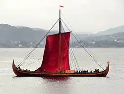 In summer 2014, skippered by Swedish captain Björn Ahlander, the longship made its first real expedition, a three-week passage under sail from Norway to Merseyside, England.[9] There it was hosted by the Liverpool Victoria Rowing Club.[9] It also visited various other locations around the coast of the British Isles, including the Isle of Man, Western Isles, Orkney and Shetland.[10]