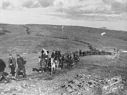 On 1 September 1944, Keserović proclaimed general mobilization.[44] In October 1944, when the Red Army entered occupied Serbia from Bulgaria, some of Keserović's troops met them and briefly occupied the town of Kruševac in central Serbia alongside them. However, within days, the Soviet troops disengaged from the Chetniks and demanded they disarm, threatening to use force if they did not. Keserović reported this to Mihailović on 19 October and refused the ultimatum, withdrawing towards the Ibar River valley with a small detachment of about 500 men. Two of his brigades were disarmed by the Red Army. Those taken into custody included Kramer, who was subsequently released.[45] Keserović himself barely escaped being captured and turned over to the Partisans.[46] On September 21 Keserović's Chetniks, along with local unit of Serbian State Guard and German artillery and aviation, inflicted biggest defeat to Partisans in fight for Serbia during 1944 between villages Velika Drenova and Parcane in Kruševac region. Partisan forces contained 3 battalions of 4th Montenegrin Brigade and 1 battalion of 3rd Serbian brigade, and were outnumbered 3 to 4 times by enemies. Partisan had 120 killed, 60 captured and "around 20 wagons of injured", whereas opposition forces had only 6 death and 14 wounded. Fate of captured partisans is unknown.[47] During night 14-15 October 4th Montenegrin brigade attacked Keserović's Chetniks that were retreating from Kruševac. At least 41 Chetniks died during attack and tens more were captured by Partisans.[48]
