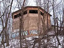 The engineers dealt with this problem as part of the comprehensive modernisation of the marshalling yard between 1928 and 1935. A rope shunting system for maintaining a controlled flow rate was installed from October 1928.[11] The rope shunting system consisted of one cable wagon each for each of the four cable haulage tracks that ran on narrow gauge tracks laid between the rails (Chemnitz Hilbersdorf marshalling yard based on this system). Two of them were connected together by a cable that ran over a pulley in the drive house on top of the hump. After the wagons were towed up the hump, the locomotive was separated and the wagons were coupled to cable wagons. When each cable wagon ran downhill, the other cable wagon it was connected to by cable was hauled up the hill.[10] The control of the machines hauling the cables in the control building was taken over by the new electro-mechanical signal box 20, so that the flow rate of wagons could be regulated. Built on a bridge above the tracks, it had a good overview of the hump and replaced the former mechanical signal box 20. Subsidiary signal boxes A–G took over control of the main distribution points.[8] In addition Deutsche Reichsbahn built several tracks covered by coarse-grained sand to stop wagons that had got out of control. These tracks still exist today.