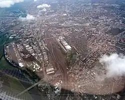 The Berliner Bahnhof, that is the terminus on the line from Berlin, was opened on the site in 1875. A marshalling yard was built from 1890 as a gravity yard, along with a repair shop (Ausbesserungswerk)—which was called the Reichsbahnausbesserungswerk Dresden from 1920—and the locomotive depot. After major destruction as a result of the air raids on Dresden during the Second World War, rebuilding began in 1945. By the turn of the century, its significance had diminished. Until the end of hump operations[3] in 2009, it was along with the Leipzig-Engelsdorf marshalling yard, the only remaining yard in Saxony to handle wagonload freight. After the turn of the millennium, it was redeveloped as a yard for the transhipment of combined transport.