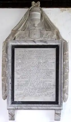 His mural monument survives in Broadhembury Church, erected after 1801 as requested in the will[29] of his eldest son and heir Francis Rose Drew (1738–1801), and displays a triple impalement: centre: (Ermine, a lion passant gules) Drew; dexter: (Sable, on a pale or three roses slipt leaved proper) Rose;[30] sinister: (Argent, a chevron between three lion's heads erased gules crowned or) Johnson. It is inscribed as follows (before much biographical details of some of his progeny):