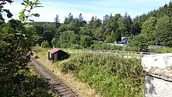 The 1899 OS map shows the single short station platform that was located on a straight section of the northern or loch side of this single track section of the branch not far from Sawmill Cottage. A road overbridge stood nearby and the lane gave direct access to the loch.[5]