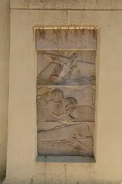 The Dual State Monument is a monument located on the border of Union County, Arkansas, and Union Parish, Louisiana. The monument was built in 1931 to mark the centennial of the establishment of the Arkansas-Louisiana state line. It also marks the birthplace of Arkansas governor George Washington Donaghey, who commissioned the monument after his retirement. The monument features Art Deco bas-relief carvings on its east and west sides. The east side features popular modes of transportation in 1831, including a steamboat, stagecoach, and covered wagon. The west side displays a locomotive, automobile, and airplane to represent the modes of transportation common in 1931. The monument was the first Art Deco-inspired sculpture erected in Arkansas.[2]