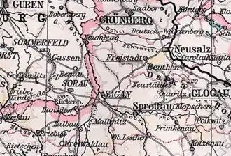 The Duchy of Żagań (Polish: Księstwo Żagańskie, Czech: Zaháňské knížectví) or Duchy of Sagan (German: Herzogtum Sagan) was one of the duchies of Silesia ruled by the Silesian Piasts. Its capital was Żagań in Lower Silesia, the territory stretched to the town of Nowogród Bobrzański in the north and reached the Lusatian Neisse at Przewóz in the west, including two villages beyond the river (Pechern and Neudorf).