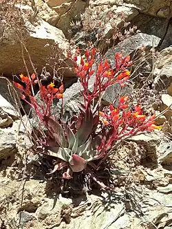 A solitary or few-branched rosette forming succulent with broad leaves and bright-yellow, orange, or red flowers.
