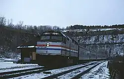 The Great Western Railway (GWR) put their line through Dundas in 1853, but it wasn't until 1864 that the first station was built.[3] They amalgamated with the Grand Trunk Railway (GTR) in 1882,[4] who constructed a new station building in 1904 and double tracked the line.[3] The GTR was absorbed by the Canadian National Railway (CNR) in 1923. Via Rail continued to provide passenger train service to the station from 1977 until the mid 1980s. A fire seriously damaged the station in 1984 and it was decided to move the historic structure to a more suitable site. The building collapsed while it was being dismantled and it could not be saved.[3] The VIA/Amtrak International continued to stop until it was rerouted in 1990. A restricted fire access route from Highway 8 is the only reminder of a railway station in the area.