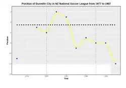 Chart of yearly ladder positions for Dunedin City in NZ 1st division soccer