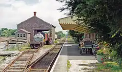 The station is located one mile from the village of Dunster, which contains many historic buildings. The stone station building and platform is on the south side-west of the line, its imposing design reflects its former status as the station for distinguished visitors to Dunster Castle. It is a Grade II listed building.[3] A goods shed was provided on the opposite side of the line, and this building and surrounding yard are now used as a workshop and base for the WSR's Permanent Way (civil engineering) department.[2]