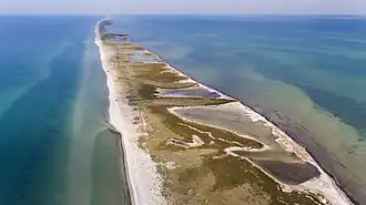 Dzharylhach Island is a long, thin line of sand and shoals, running west-to-east in the bay between the Crimean Peninsula to the south, and the mainland to the north. At times of low water, the shoals can become exposed to join the island as a spit of the mainland. The coastal waters are very shallow, typically less than 1 meter.[7] The characteristic salty soil of the island is called solonetz. The bay is part of the Ramsar site Karkinitska and Dzharylgatska Bays.[7]