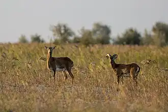 The plants on the island are specialized for the environment, and include psammophytes (plants that grow in loose and shifting sand), halophytes (plants adapted to saline habitats), reed-beds in fresh and saline wetlands, the representative flora of coastal meadows and seaside steppe, and synanthropes (wild plants associated with proximity to humans, in this case tree and shrub plantations). Over 500 species of vascular plants, in 72 families are recorded in the terrestrial borders of the park.[1][7]