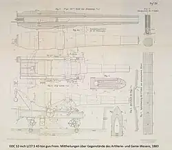 At the time, 'chambering' meant that the powder chamber of a gun got a bigger diameter than the barrel. Chambering allowed the use of bigger charges that nevertheless resulted in lower peak pressures inside the gun. In October 1876 the Royal Arsenal at Woolwich had tested the chambered RML 12.5-inch 38-ton gun.[2] The Krupp 24 cm MRK L/25.5 prototype, that was first tested in December 1878, was also a chambered gun. It was about as powerful as the RML 12.5-inch 38-ton gun, but weighed only 18t.[3]