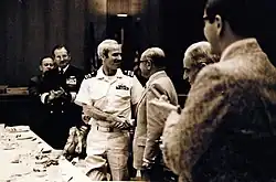 As commanding officer, McCain relied upon a relatively unorthodox leadership style based upon the force of his personality.[227] He removed personnel he thought ineffective, and sought to improve morale and productivity by establishing an informal rapport with enlisted men.[82][225][227] Dealing with limited post-Vietnam defense budgets and parts shortages,[82][225] he was forceful in demanding that respect be given to the female officers just beginning to arrive into the unit.[227] McCain's leadership abilities were credited with improving the unit's aircraft readiness; for the first time, all fifty of its aircraft were able to fly.[82][225] Although some operational metrics declined during the period,[224][227] the pilot safety improved to the point of having zero accidents.[224][225] The squadron was awarded its first-ever Meritorious Unit Commendation,[223] while McCain received a Meritorious Service Medal.[117] McCain later stated that being commanding officer of VA-174 was the most rewarding assignment of his naval career.[228] When his stint ended in July 1977,[223] the change of command ceremony was attended by his father and the rest of his family, as well as some of his fellow POWs; speaker Admiral Isaac C. Kidd, Jr. said that John had joined Jack and Slew McCain in a place of honor in Navy tradition, a tribute that deeply moved McCain.[221]