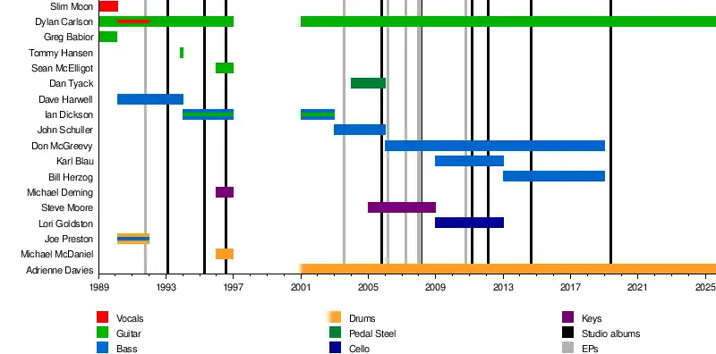 Earth is an American rock band originally based in Olympia, Washington and led by the guitarist Dylan Carlson.[1][7] Initially active between 1989 and 1997, their early work is characterized by heavily distorted guitar, drones, and lengthy, minimalist song structures; their 1993 debut album Earth 2 is recognized as a pioneering work of the drone metal genre.[1][3] The band resurfaced in the early 2000s, with their subsequent output reducing the distortion and incorporating elements of country, jazz rock, and folk.[3] Earth's current lineup consists of Carlson and drummer Adrienne Davies. Often Bill Herzog is on bass as well as other Earth members, past present and future.
