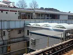 The original NYW&B station house on Morris Park Avenue is still in use as the main entrance. The station was designed by Fellheimer & Long with Allen H. Stem Associated Architects.[32] The building is made of concrete and has a three-story central section flanked by four-story projecting end pavilions; in addition, it has a street level loggia.[33]