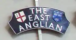 Unlike the special carriages built for the other streamlined services, the East Anglian carriages were not articulated, and were not streamlined either – they were of normal external appearance, with varnished teak finish, although they did conform to the latest LNER practice in that the external doors were in the vestibules, rather than in the seating areas. The body dimensions – 61 feet 6 inches (18.75 m)x9 feet 3 inches (2.82 m) (18.75 m × 2.82 m) (on 60 feet 0 inches or 18.29 metres underframes) – were the same as standard LNER carriages, and thus somewhat longer than general-service LNER carriages built for the GE section, which were typically 52 feet 6 inches (16.00 m) long (on 51 feet 0 inches or 15.54 metres underframes) until 1938.[8] The bogies were of standard LNER pattern (having wheelbase 8 feet 6 inches (2.59 m)) as used with all other non-articulated Gresley stock. The internal styling was very similar to that of the Coronation and the West Riding Limited, except that the first class seating was arranged 2+1 instead of 1+1.[4] There were no compartments, each carriage being divided into two or three open saloons; in both classes, seating was arranged 2+1 in bays of six, and all 198 seats were available for dining.[4] Each seating bay had a table either side of the off-centre aisle, and the tables had two hinges along their length so that passengers could sit close to the tables without leaning forward when eating, yet still be able to get past the fixed armrests: the double first-class seats had a centre armrest, which the double third-class seats lacked.[4] There was one toilet in each coach, except the open first which had two. The two restaurant cars each had an attendant's compartment, kitchen (with electric cooking) and pantry; the toilet in these cars was for staff use only.[9] The pantry included a buffet counter, and the third-class pantry was slightly smaller than that of the first-class. Three of the six carriages (those to Diagrams 237, 238 and 239) were unique, and the two brake thirds were the only ones built to Diagram 240. Only in the case of Diagram 236 were other carriages built to the same design: nos. 658 and 678 (1943 nos. 9185 and 9171) were built against Lot no. 780 Doncaster 1937-38, for use on other long-distance services on the Great Eastern section, such as Harwich-Liverpool.[10] No. 677 was later declassified to Restaurant Kitchen Third, Diagram 264 (as was no. 658).[11]