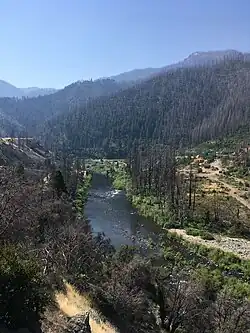 From the confluence, the East Branch winds west for 18.1 miles (29.1 km)[1] through a steep and narrow canyon until its confluence with the North Fork next to Caribou Rd (40°00'49.9"N 121°13'32.4"W), about 60 miles (97 km) northeast of Oroville. The river canyon is an important transportation corridor, forming route for SR 70, which parallels the north bank of the river, and for the Union Pacific Railroad's Feather River Route on the south bank. The Feather River Route was originally constructed between 1906 and 1909 while the highway was built in the 1920s.