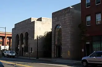 The bank's Art Deco headquarters building at 292 Cambridge Street in East Cambridge, Massachusetts was built in 1931 to a design by T. M. James. It has a triple-arched front facade, an element repeated on the side with three similarly scaled round-arch windows. Bands of carving adorn an entablature band at the top of the main wall, and on a stepped back section above. The building's interior includes sculpture by Paul Fjelde and murals painted by Alfred Rasmussen.[2] The building was listed on the National Register of Historic Places in 1982.[1]