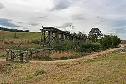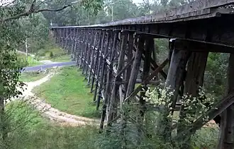 The track leaves Nowa Nowa after crossing the bridge over Boggy Creek and soon rejoins the railway line formation. The former Nowa Nowa railway station is just north of the realigned rail trail, with the station site itself now used as an emergency helicopter landing place.[5] Not far from town the track descends to a creek level crossing over Ironstone Creek, bypassing the first and smallest of three wooden trestle bridges in this section.[7] Following this the track steadily climbs over several kilometres on a rough loose gravel surface through a gradually drier environment largely composed of banksia and eucalypt vegetation, and areas of open farmland, then descends towards Wairewa Road[7] about 9 km from Nowa Nowa.[8] The original rail line crossed this spot on a spectacular curved timber trestle bridge, the largest of the three on this part of the route. While the bridge remains, the trail again bypasses it due to the costs that would be involved in making and keeping the bridge safe, descending down and across Wairewa Road, then climbing back up to the level of the railway.[7]