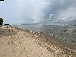 A thin stretch of sand beach juts northward into the waters of Lake Erie, separating Middle Harbor from the lake. Part of this beach was damaged in 1972 by a storm washing away a large section of the two-mile (3 km) beach. The current beach is a much smaller area to the north of the park, where swimming is permitted.[3] Four segmented offshore breakwaters have been constructed on the northern section of beach, to sustain what is left of the sandy shoreline.[4]