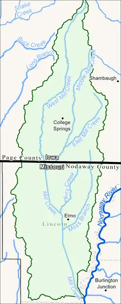Beginning near the midpoint between College Springs and Shambaugh, East Mill Creek flows southerly and then southwesterly passed College Springs to the south.[7] It is joined by Middle Mill Creek one mile north of the Iowa-Missouri border and continues southwest where it meets West Mill Creek and forms Mill Creek three-fifths of a mile south of the aforementioned state border in northwestern Nodaway County, Missouri.